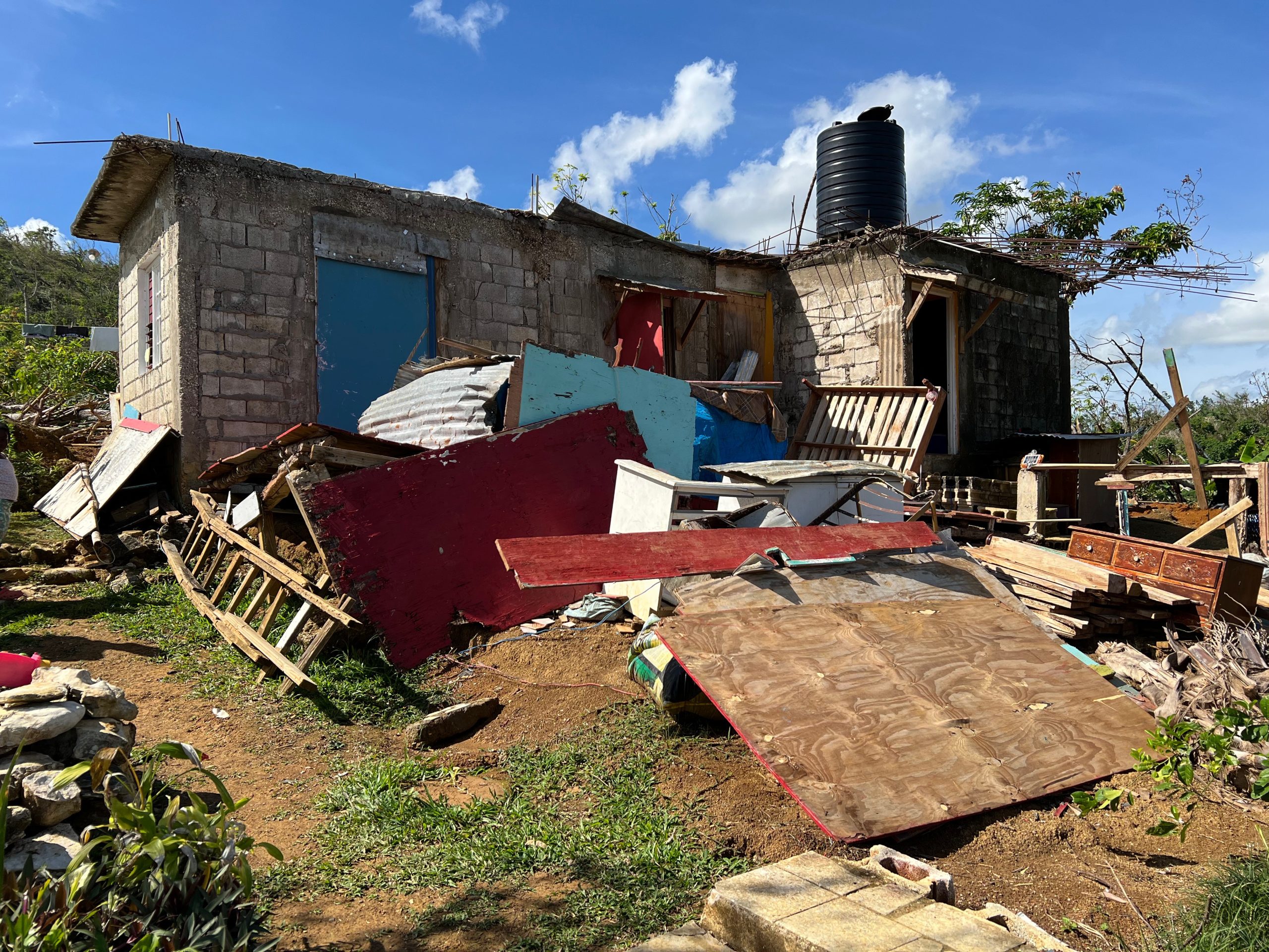 They have worked tirelessly to clear debris and are attempting to build a new room at the back of the house using salvaged materials. They currently have no electricity, with restoration not expected until summer 2026. Water remains a major challenge: although their storage tanks survived, the roof catchment system was torn away. Water is now trucked into the area and must be carried uphill to their home. There has been no trash collection for two months, adding to health concerns. Alecia’s primary school was badly damaged, so she remains out of school.