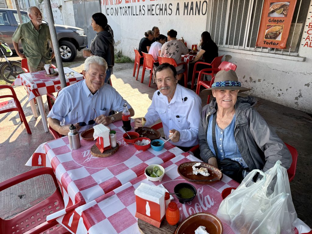 On the first day of the Study Weekend, we had a tasty breakfast of beef soft tacos on the way to the venue. The Jalisco Sur Ecclesia currently meets in a locale rented by Sister Guadalupe Hernandez which is a small grocery store in the front, but has a large back area which works as a meeting room for the small ecclesia. After the first two classes, one given by Brother Dennis, and the other, by me, we went outside in the patio area behind the store and enjoyed a delicious lunch and fellowship with the brothers and sisters, before we went inside for my second class, the third and final class of the day. About 16 or 17 were in attendance, including several who attended in person, and others who were online. There was lively discussion during the classes, both by those in person and those online, and many deep spiritual insights. Brother Gabriel and Sister Cynthia did a wonderful job organizing the day, and Cynthia worked hard throughout the classes, making sure that the online attendees could see the PowerPoint slides, and could hear and participate in the classes.
