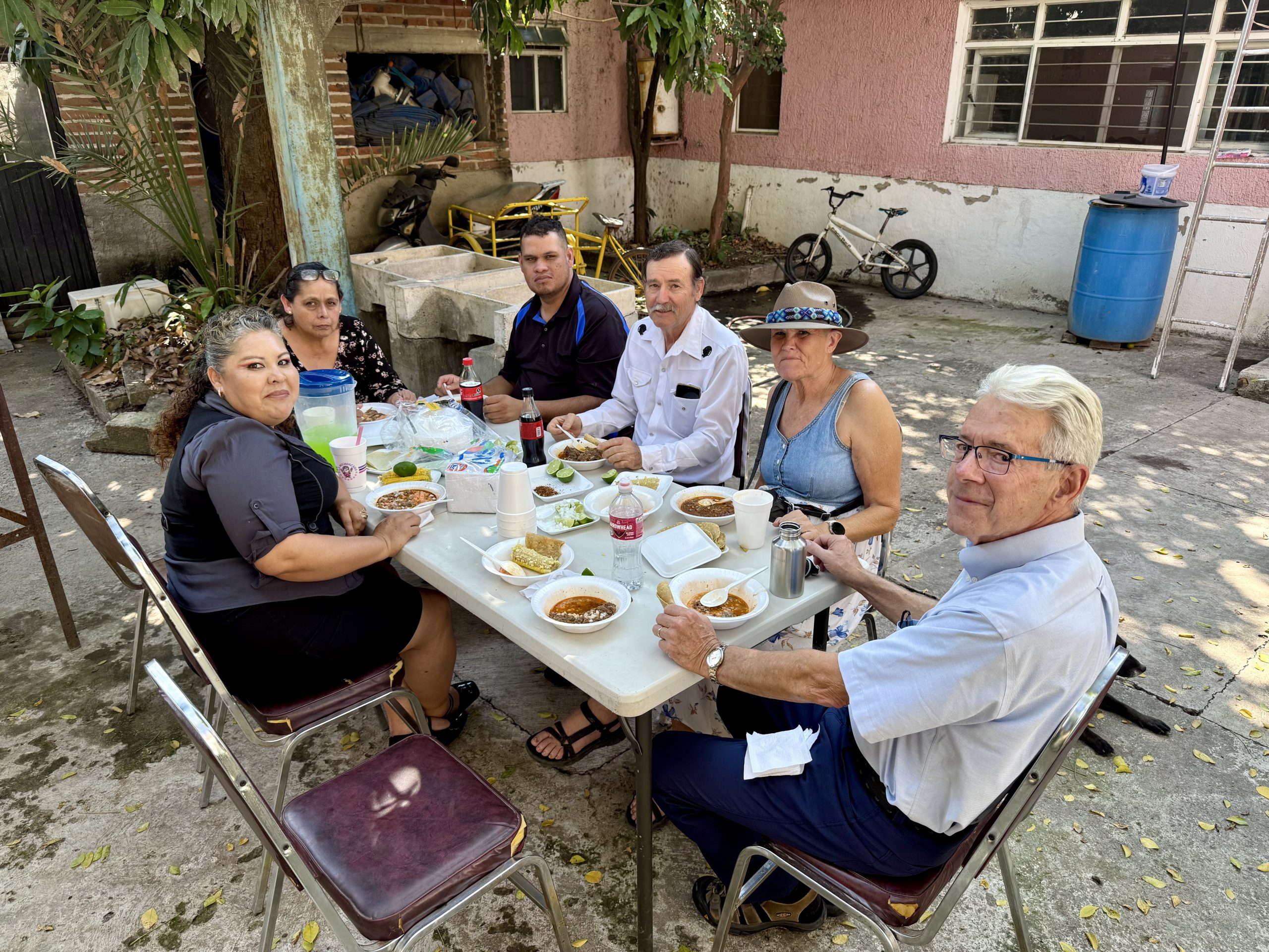 On Sunday morning, we left for the meeting venue, and stopped on the way to have another tasty breakfast of soft tacos. While there, we picked up birria, which Sister Cynthia had ordered beforehand, to take to the venue and eat for lunch. Birria is a rich tender meat stew made with beef, lamb or goat, which is simmered slowly in a seasoned broth, a delicious, typical Mexican dish. Our birria was made with goat meat.